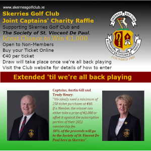 we have decided to extend the Captains’ Charity Raffle until the distance restrictions have been lifted and we have all had a chance to return to playing golf. To those who have already purchased their ticket, thank you for your patience.